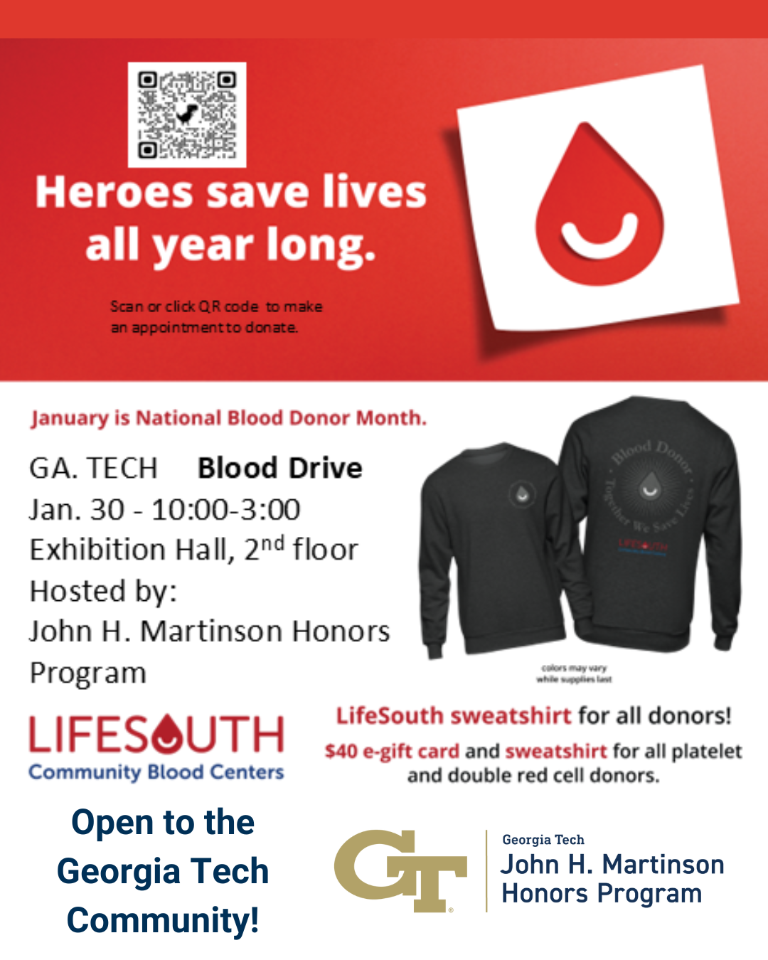 Hosted by the Honors Leadership Council's Civic Service Committee, the John H. Martinson Honors Program is hosting a campus-wide donation drive with LifeSouth. The event will be on Friday, January 30th 2026 from 10:00am-3:00pm in the Exhibition Hall in the Home Park room on the second floor. This opportunity is open to the Georgia Tech community, so share with those you know! More information will be emailed to attendees who sign up.