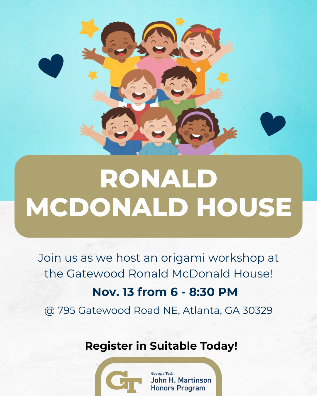 Come join the Civic Service Committee as we volunteer with the Ronald McDonald Gatewood House on Thursday, November 13th! We will be doing an origami activity with kids and their parents. No origami experience required.